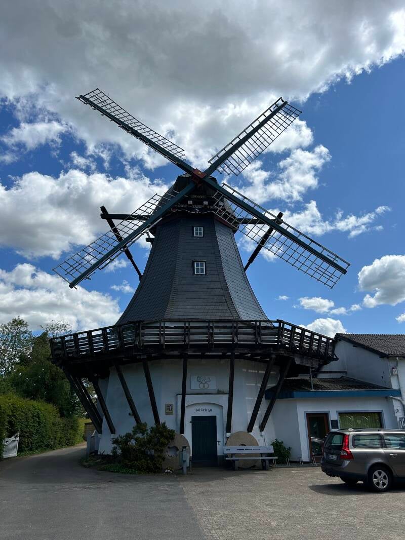 Een dik uurtje later zijn we aangekomen in Tarp, een klein dorpje net onder de grens met Denemarken. Hier gaan we onze eerste overnachting doen alvorens we morgen verder rijden naar Denemarken. Omdat we ruim op tijd aangekomen zijn, gaan we eerst een kleine verkenningswandeling doen door het dorp alvorens in te checken in ons hotel. Ze hebben hier een mooie antieke windmolen die Antje heet en er zijn wat bewegwijzerde wandelingen.
