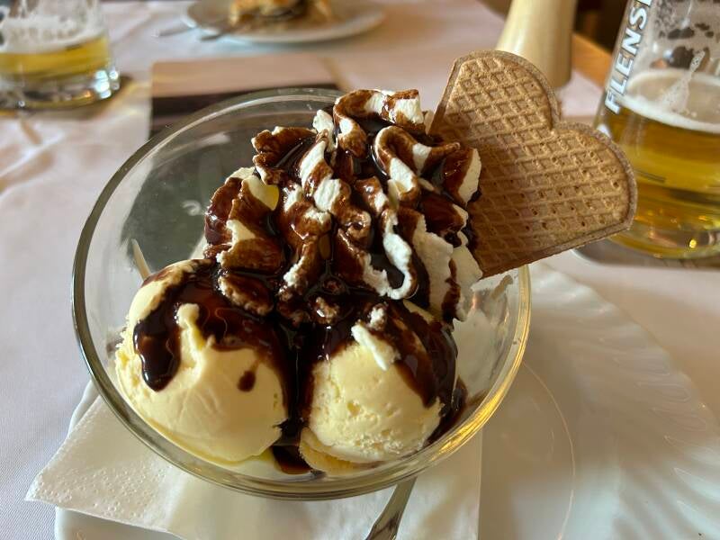 Ook al is het dorpje maar een zakdoek groot, omkomen van de honger ga je hier zeker niet. Op een paar honderd meter telden we al zeker twee griekse restaurants, twee pizzeria's, een kebab-zaak en nog een paar andere eetgelegenheden. Keuze genoeg dus, maar we besluiten om vanavond in ons hotel te eten. Een hotel dat trouwens 200% meevalt. Het personeel is supervriendelijk en goedgeluimd, en het eten is er ook zeer lekker. Uiteraard moeten we ook een streekbier(tje) proeven.