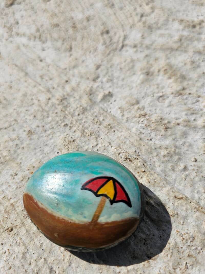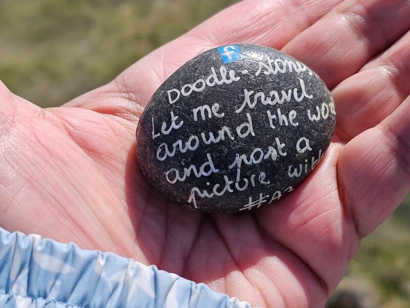 Carine maakt van de gelegenheid gebruik om hier een doodle-stone achter te laten. Dat is een beschilderde steen die rond de wereld reist. Wie hem vindt of krijgt wordt verzocht die ergens anders op de wereld achter te laten. Aangezien dit zowat het verste is dat we dit jaar gaan komen is dit de ideale plek om hem achter te laten.