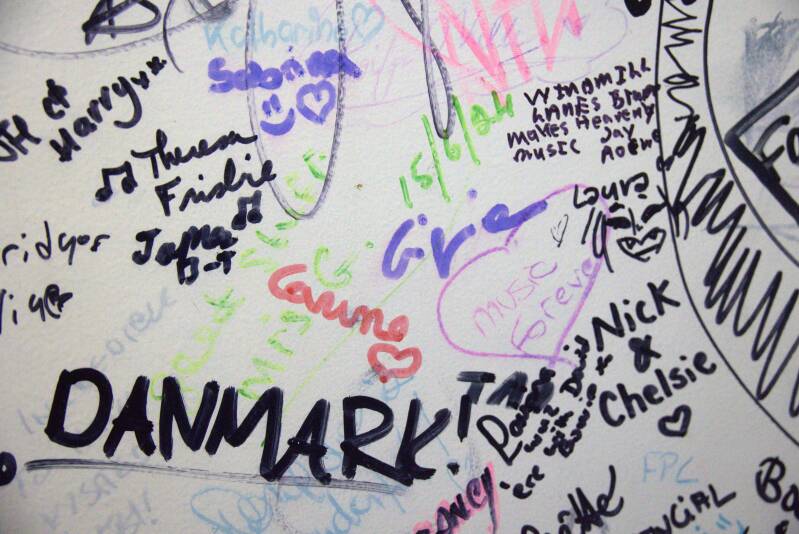 Op de muren in de gang naar studio 1 hebben de artiesten die er hebben opgenomen allemaal een boodschap achter gelaten.