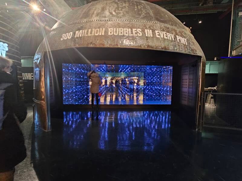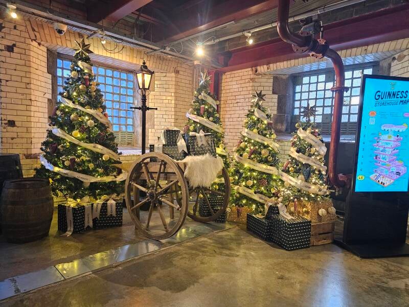 Omdat het al eind november is, en ze er hier in Dublin graag op tijd bij zijn, is het hele storehouse al in kerstsfeer gebracht. Dat geeft het impressionante gebouw extra uitstraling. In totaal hebben ze hier 7 verdiepingen, die we allemaal gaan proberen te bezoeken. Op de eerste verdieping vinden we de grote inkomhal en ook de winkel waar je alle mogelijk Guinness-merchandising kan kopen. Vanaf hier begint ook de trip door de interactieve tentoonstelling over het ontstaan van het Guinness-bier. We hebben al verschillende brouwerijen bezocht, maar deze tentoonstelling steekt toch met kop en nek uit boven al wat we tot nu toe al bezocht hebben. Er werd hier duidelijk niet op een euro meer of minder gekeken.