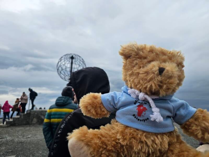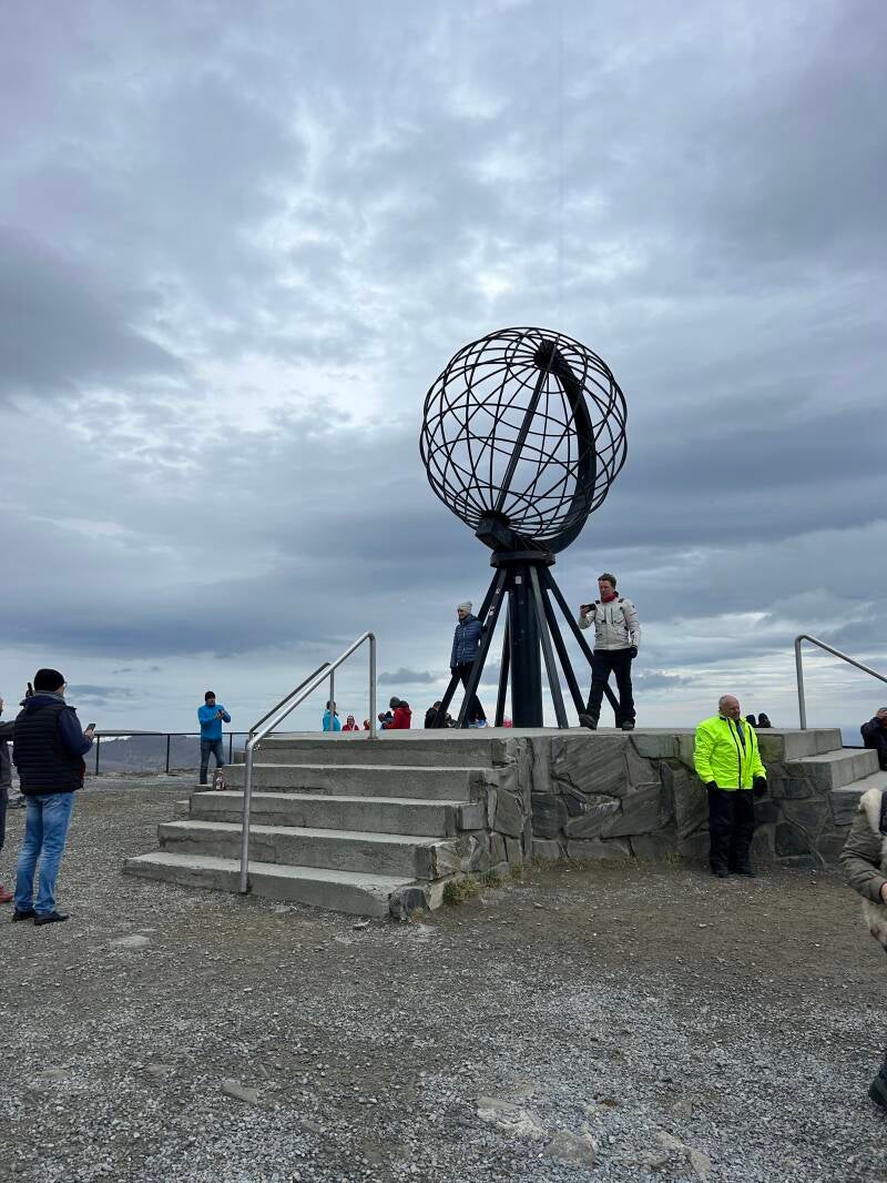 En dan komen we aan bij de Noordkaap, het meest noordelijke punt van Europa. We bevinden ons zo'n 300 meter boven de zeespiegel bij het iconische wereldbol-monument.