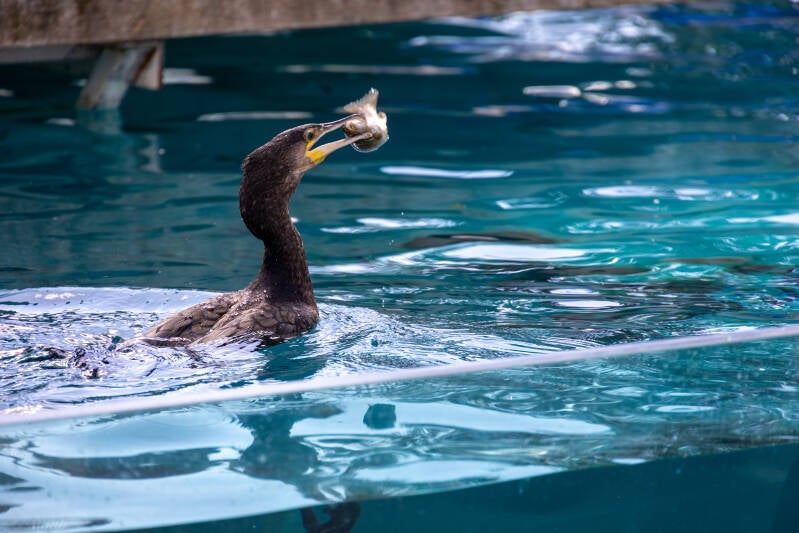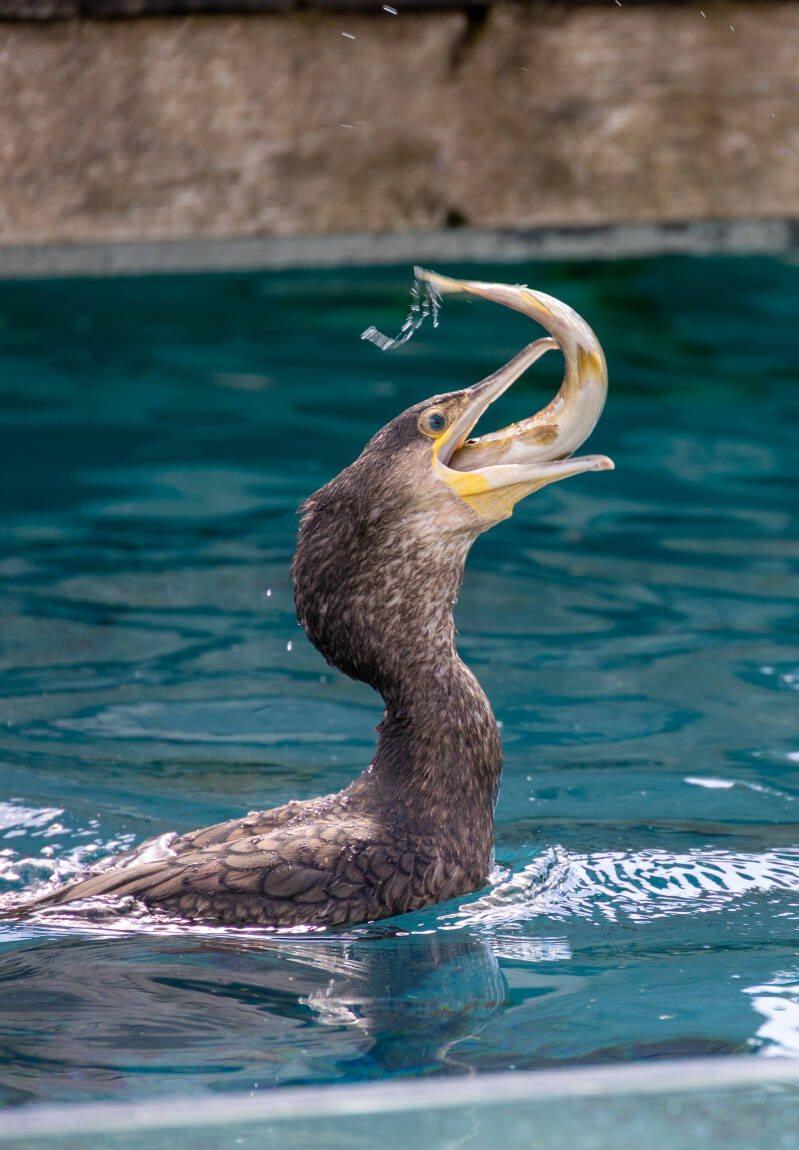 Op het einde van voorstelling krijgen we ook nog een demonstratie met aalschovers. Daarvoor worden er in het bassin voor ons 4 visjes losgelaten, waarna er vervolgens twee aalscholvers achteraan gaan. In een paar seconden hebben deze vogels de vissen onderwater gevangen en verorberd.