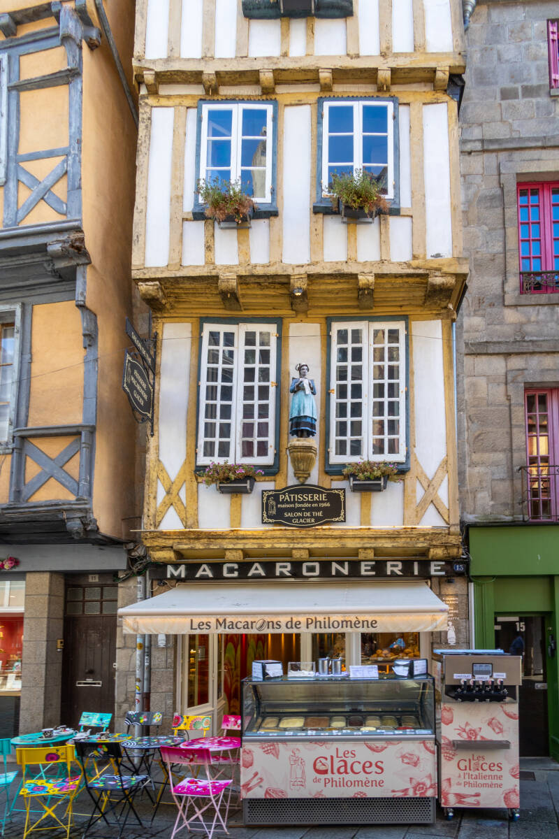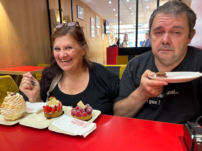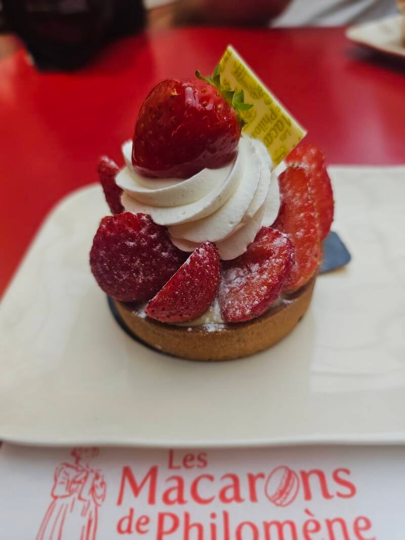 In onze zoektocht naar het toeristentreintje waarmee we willen gaan rondrijden komen we aan Les Macarons de Philomène voorbij, Dat is een koffiehuisje met een enorm aanbod aan taartjes en macarons; Daar kunnen we niet zo maar voorbij lopen.