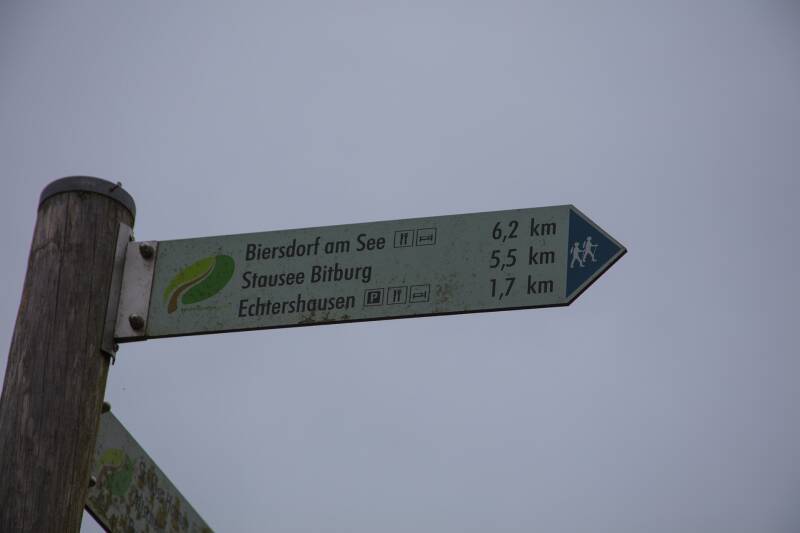 Na een tijdje naast de Prüm gewandeld te hebben komen we aan een brug, waar we de rivier kunnen oversteken. Daarna gingen we even in de fout. In ons enthousiasme hadden we een wegwijzer over het hoofd gezien en kwamen we op een doodlopend stuk uit. Dan maar terugkeren en deze keer goed opletten. En ja hoor, er was nog een pad dat steil omhoog liep, en dat moesten we volgen.