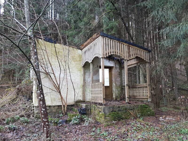 Het eerste stuk van de wandeling is een afdaling tot aan de oever van het riviertje de Prüm. Dat komt uit in de Bitburger Stausee, een beetje verderop in Biersdorf am See. De Prüm kronkelt hier door het landschap, een beetje zoals de Semois dat bij ons in België doet. Heel veel bomen hier hebben een dik laagje mos op zich. Daar zal de vochtige omgeving waarschijnlijk wel iets mee te maken hebben. Onderweg komen we ook nog een vervallen huisje tegen, waar de natuur langzaam maar zeker terug de overhand aan het krijgen is.