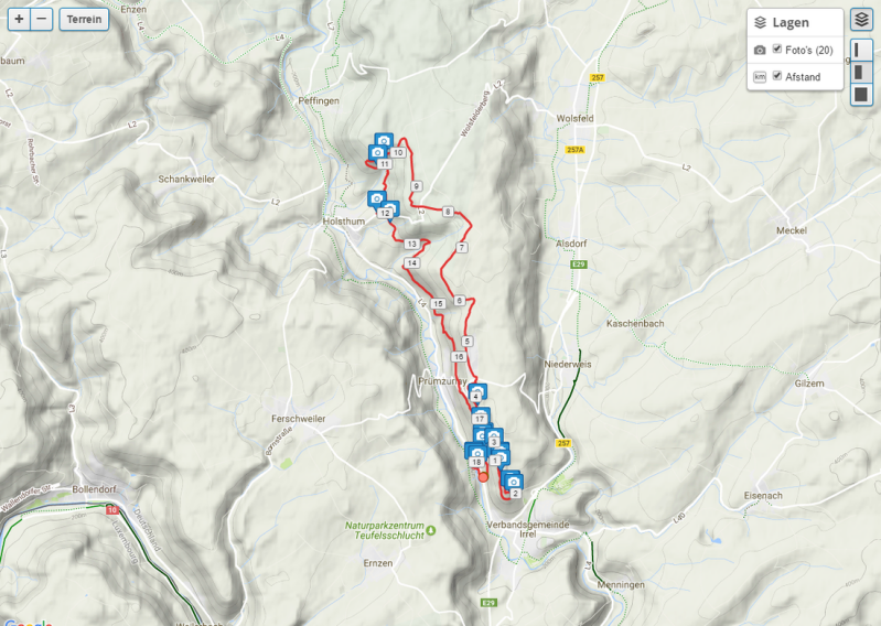 Vandaag trekken we opnieuw onze wandelschoenen aan, deze keer voor een flinke wandeling in Irrel. Een klein dorpje, ten zuiden van Bitburg. In Irrel vind je prachtige zandsteenrotsen en kloven. één van die kloven is ook gekend onder de naam “Teufelsslucht”, nog niet zo’n gekke naam, als je weet dat de postcode van Irrel 54666 is De Teufelsschlucht hebben we een paar jaar geleden al eens verkend. Nu maken we een rondwandeling die voor een stuk boven op de rotsen loopt en die eindigt aan de Irreler Wasserfälle.