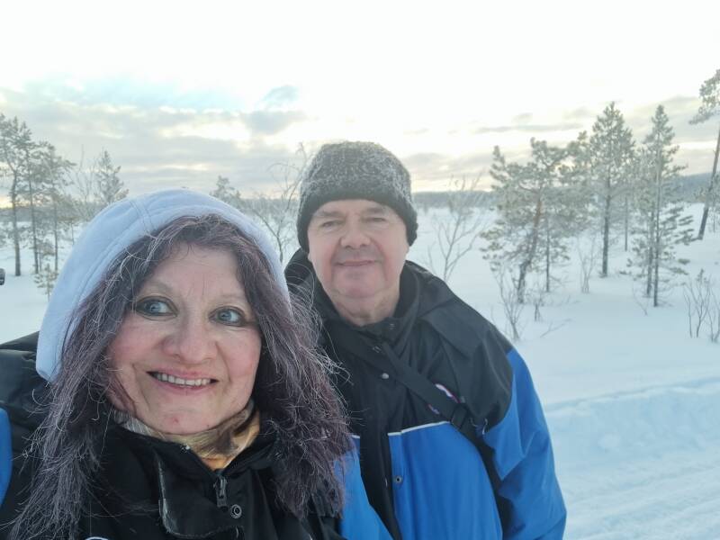 Vandaag is het onze vrije dag, we hebben geen activiteiten vandaag en kunnen dus onze zin doen. Annie en Luc gaan vandaag wel een dagtocht doen met de husky's. We besluiten om hen te gaan fotograferen en filmen bij het begin van hun tocht. Daarom trekken we naar de andere kant van de grote baan, daar waar de sami-tent staat om hen op te wachten. We horen de honden in de kennel luid blaffen, dat is meestal een teken dat ze daar bijna gaan vertrekken. Dus brengen we alles in gereedheid. Carine staat klaar met haar fototoestel in de aanslag. Patrick heeft een vaste videocamera opgesteld naast het traject en de drone is klaar om op te stijgen. Op die manier hebben we hun doortocht voor het nageslacht kunnen vastleggen.