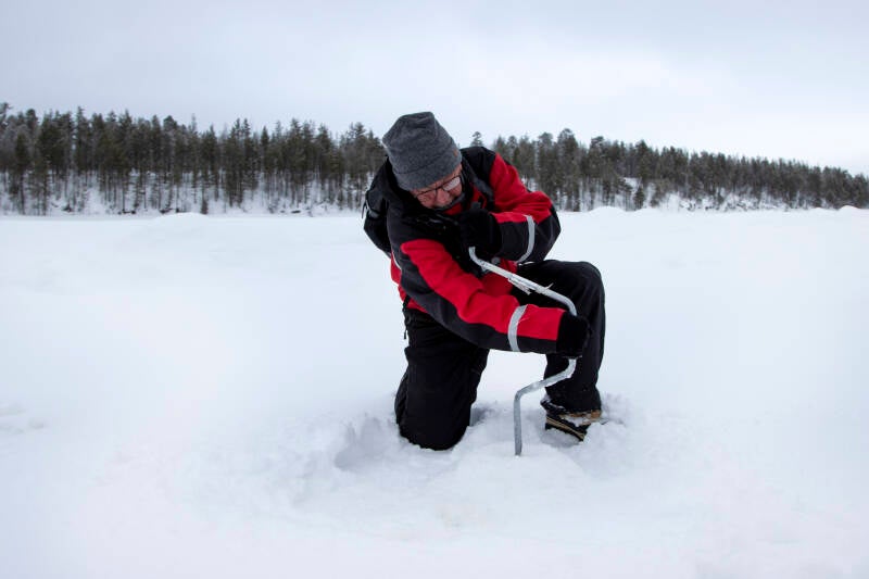 Om 13 uur worden we geacht te gaan ijsvissen. Onze gids staat ons al op te wachten. Ver moesten we niet gaan, want we gaan ijsvissen op het ijs dat op de Muonio-rivier ligt, en deze ligt hier vlak voor de deur. Ijsvissen is niet echt moeilijk, het enige wat je nodig hebt is een boor om een gat in het ijs te maken en een vislijntje. En verder heb je geduld nodig, heel veel geduld. Omdat we geen vis lusten kon het ons weinig schelen of we een vis zouden bovenhalen. Na twee uurtjes op het ijs had nog altijd niemand iets aan de lijn gekregen. Maar ondertussen hadden we al heel wat nieuwe vriendjes en vriendinnetjes leren kennen.