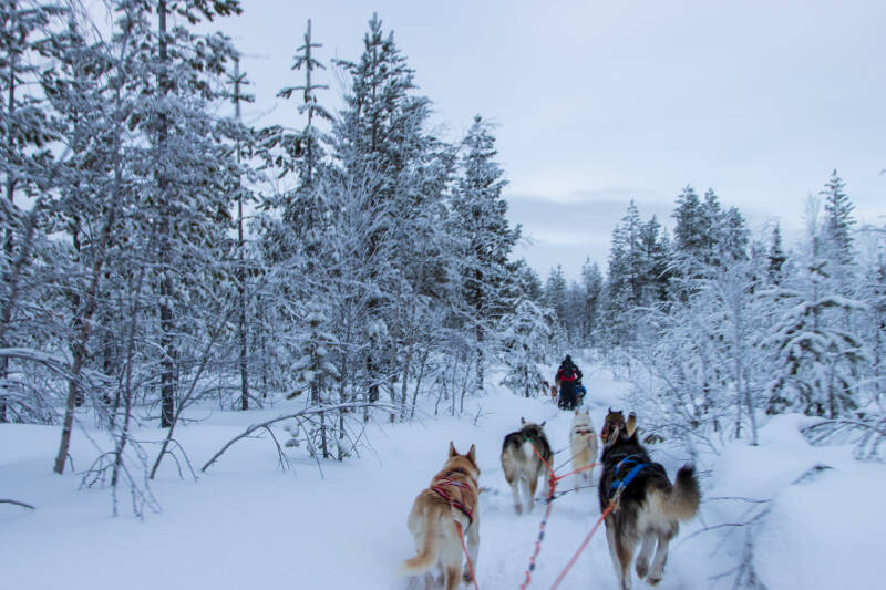 Daarna keren we terug naar Harriniva, het is al bijna 12 uur, tijd voor de lunch. Die was ook deze keer weer dik in orde. Er stond onder andere lasagne op het menu. Om 13 uur worden we opnieuw buiten verwacht voor onze Husky-safari. We gaan een toertje maken door de bevroren moerassen van Muonio. Persoonlijk vinden we zo'n tocht met de Husky's één van de leukste dingen we in Lapland doen. Het gevoel dat je hebt wanneer je achteraan op zo'n slee staat is fantastisch. Je glijdt met je slee door de besneeuwde landschappen waarbij het geluid van de slee die door de sneeuw schuift het enige is wat je hoort. De honden genieten zichtbaar van hun taak, ook voor hen is dit genieten.