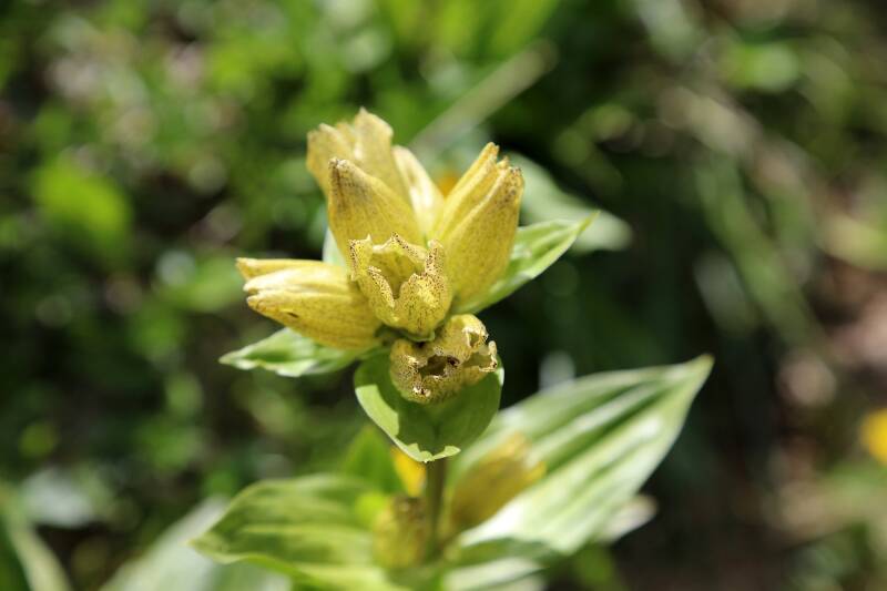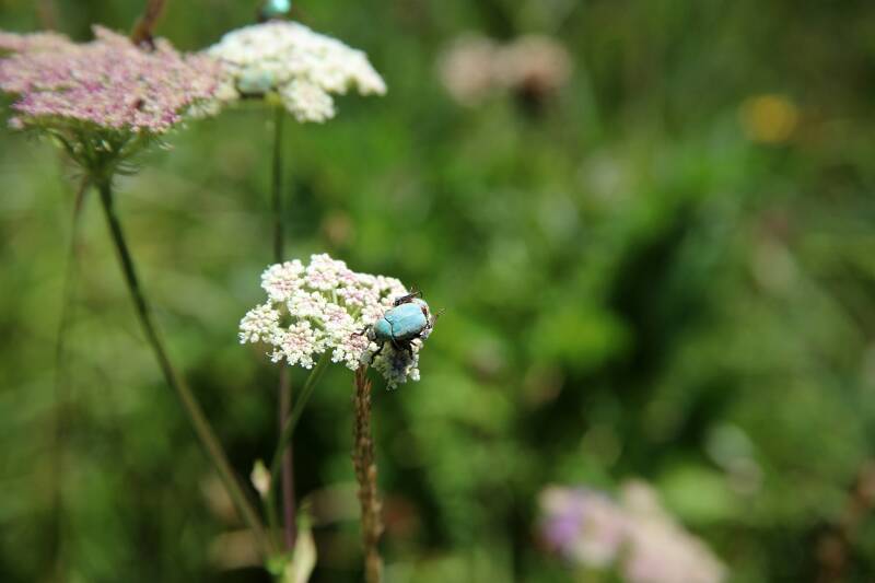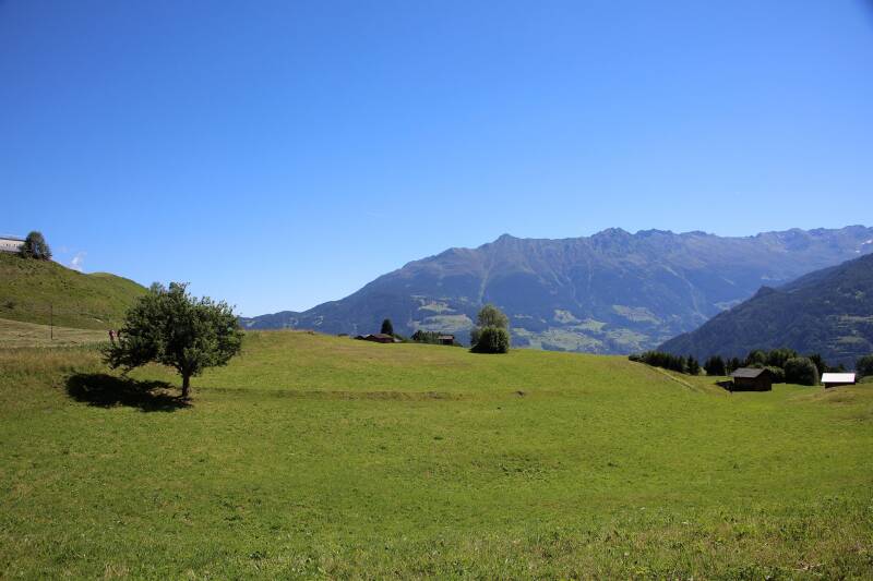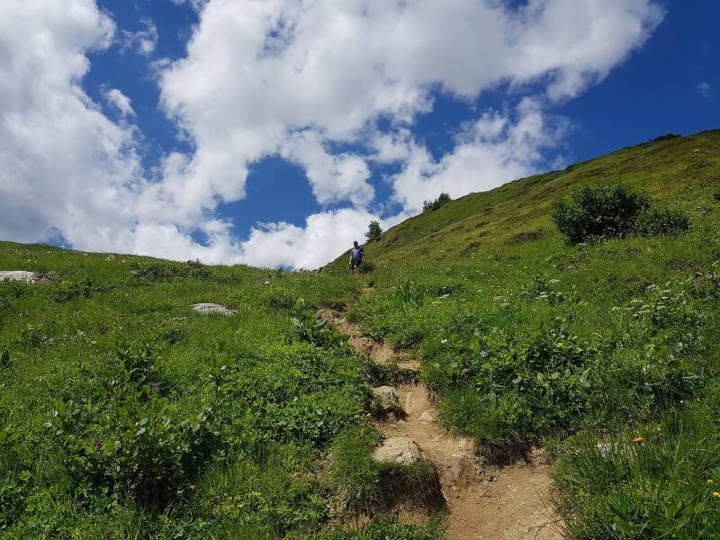 Onze wandeling gaat verder tussen de alpenweides. De boeren zijn al druk bezig met het hooi te maaien. Ze profiteren net als wij van het mooie weer, maar dan wel om verschillende redenen. De natuur is één en al bedrijvigheid, alles zoemt en vliegt in het rond.