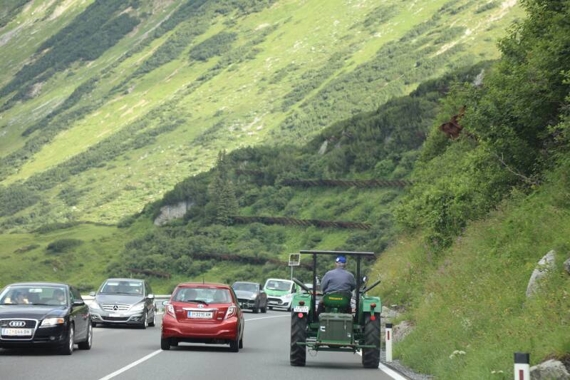 Het eerste deel van onze terugreis leidt ons over de Arlnbergpas, waar er nog niet al te veel verkeer te bespeuren valt. Met uitzondering van een groep antieke-tractor-fanaten.
