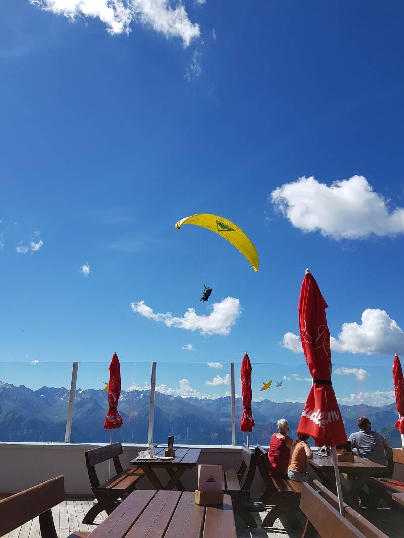 Vandaag zijn er niet alleen wandelaars boven op de berg, maar ook parasailers, waarvan er sommigen aan het terras voorbijvliegen.