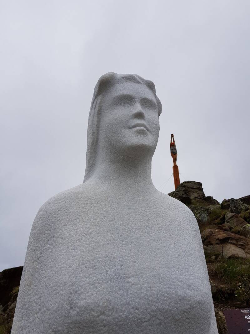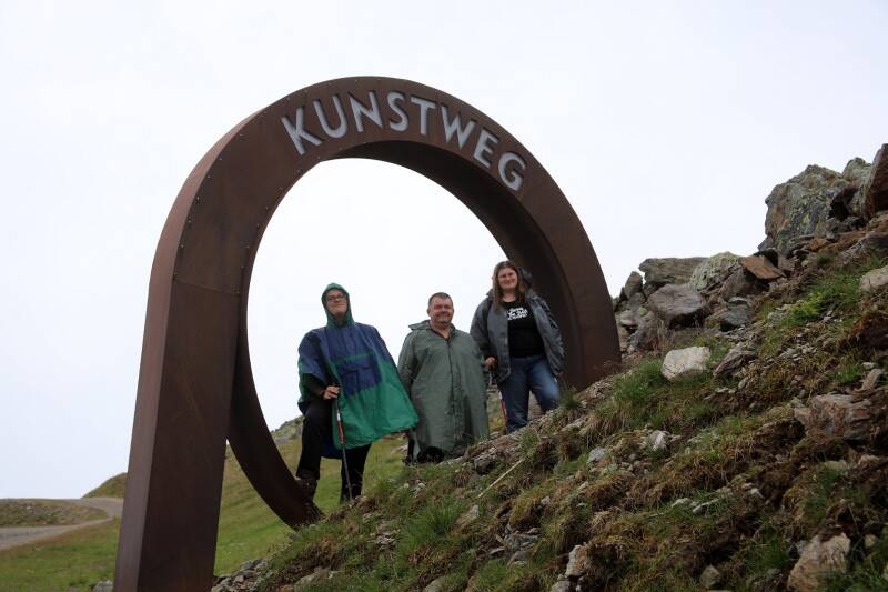 Maar we trekken ons niet te veel aan van de nattigheid, we gaan vandaag met de Schönjöchbahn naar omhoog, om daar een wandeling te doen naar het kruis op de SchönJöchl en vandaar verder naar het Wetterkreuz. Naast het bergstation van de kabellift is er ook een openluchttentoonstelling van kunstwerken. Die kunstwerken kan je op het eind van het seizoen kopen. Er staat wel nergens vermeld of men je aankoop aan huis aflevert. Iets wat toch wel belangrijk is als je weet dat er een paar creaties staan die meerdere honderden kilo’s wegen.
