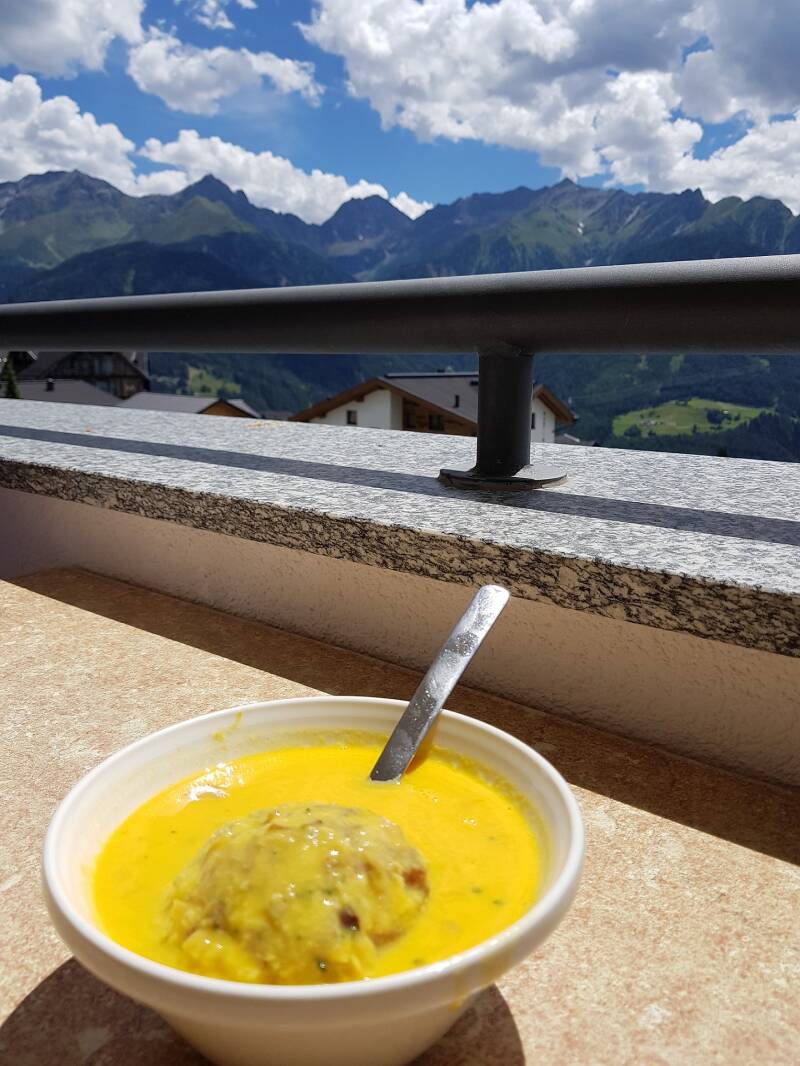 Van wandelen krijg je honger, en omdat we vandaag al genoeg inspanningen geleverd hebben gaan we niet zelf koken maar uit eten. De Dorfalm is een restaurant waar we tijdens onze vorige vakanties in Fiss al heel lekker gegeten hebben. Dus trekken we daar vanavond ook weer naar toe.