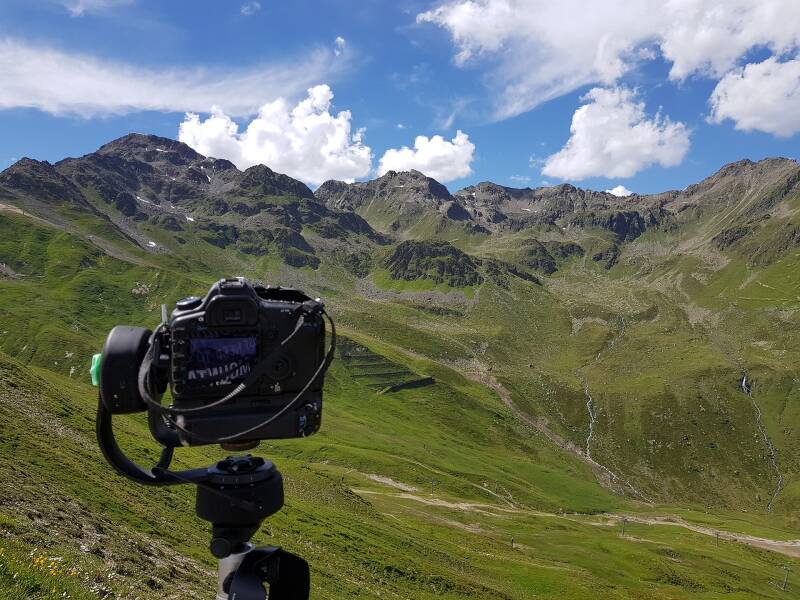 Wie ons een beetje kent, die weet dat we gek zijn van fotografie en video, en dat we ook graag speciale snufjes gebruiken om onze vakanties te documenteren. Vandaag gaan we ons nog een helemaal laten gaan op dat vlak. Gisteren was een wandeldag, dus is vandaag een fotodag. Zo wisselen wij iedere keer af. ’s Ochtends na het ontbijt vertrekt Patrick met een rugzak vol “gerief” naar de Schonjoch. Het is de bedoeling om hier een paar gigapixel foto’s te maken.
