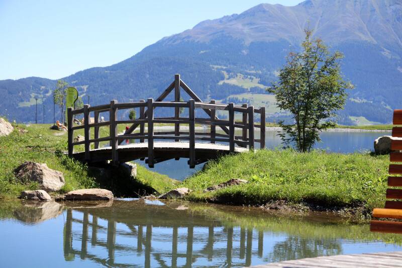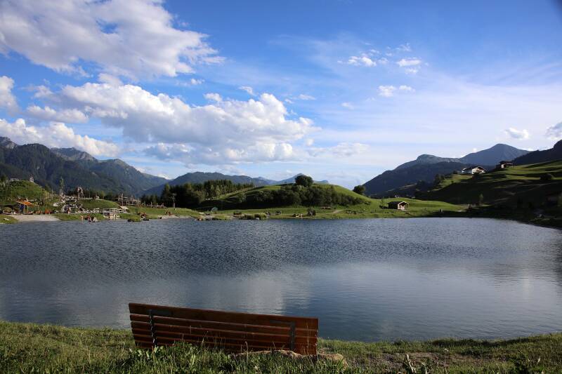 We hebben zo een aantal vast gewoontes als we op vakantie gaan in de bergen. Eentje daarvan is naar Obladis wandelen om daar een ijsje te gaan eten. Vandaag is het de perfecte dag om dat te doen. Omdat de wandelwegen hier heel goed bewegwijzerd zijn, en we de streek nu stilletjesaan wel een beetje kennen, hoeven we niet op voorhand nog een route te plannen op de gps. We geraken er zo ook wel. Onze eerste halte is de Wolfsee. Dat is net zoals de Högsee in Serfaus een kunstmatig meer dat dient als watervoorraad voor de besneeuwingsinstallaties van de skipistes. Net zoals in Serfaus heeft men er ook hier voor gekozen om het geheel een beetje attraktiever aan te kleden. Wij beperken ons vandaag tot het voorbijlopen van de Wolfsee.