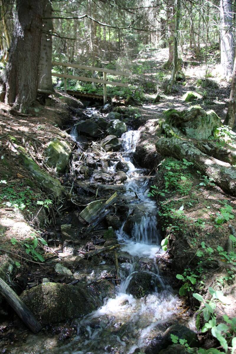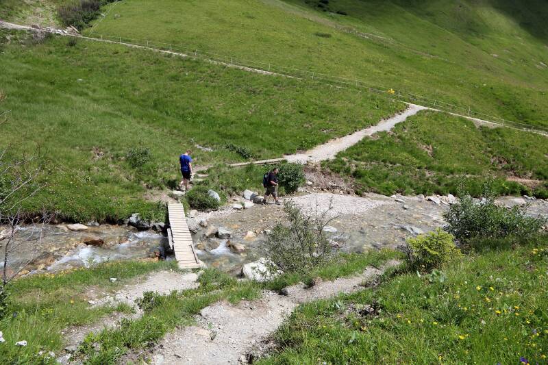 In de verte zien we het bruggetje dat het doel van onze wandeling is. Maar zoals dat vaak in de bergen het geval is, is de afstand bedrieglijk en zijn we nog wel even onderweg voor we aan ons doel aankomen