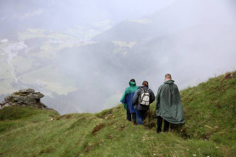 Het is vandaag onze eerste echte dag in Fiss. Het weer is nog niet helemaal hoe het zou moeten zijn. Het regent niet, maar de bergen hangen in de wolken. En wie vroeger goed opgelet heeft op school, die weet dat wolken eigenlijk water zijn, dus gaan we onze regenkledij moeten meenemen.