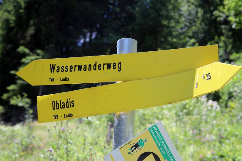 Daarna is het tijd om verder te gaan, richting Ladis. Dat kan langs verschillende wegen, maar we kiezen voor de Wasserwanderweg. Dat is een themawandeling die het water als thema heeft. We lopen de wandeling wel in de omgekeerde richting, want normaal gezien vertrekt de wandeling beneden in Ladis.