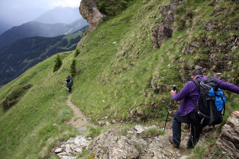 Dan beginnen we aan de afdaling in de richting van het tussenstation van de Schönjöglbahn. In afstand is dat niet zo ver, maar we moeten bijna 600 meter afdalen over smalle bergpaadjes, die er ook nog glad bijliggen. Dat vraagt veel van je spieren. Want afdalen is veel lastiger dan stijgen. En dat hebben we gevoeld !