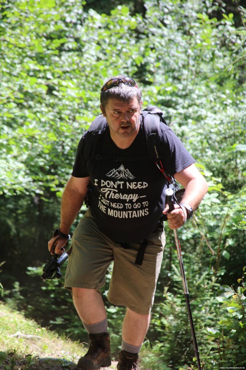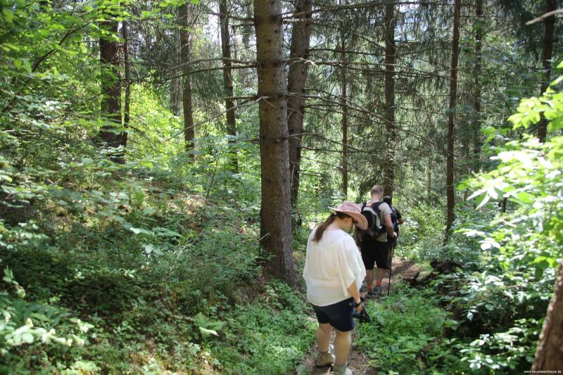 Na een beetje zoekwerk om een parkeerplaats te vinden die in de buurt van de start van onze geplande wandeling ligt, parkeren we aan de kerk. Van hier uit is het een paar honderd meter gaan voor we via een steil paadje het bos intrekken. Onze nog stramme spieren laten al meteen merken dat ze dit niet zo leuk vinden. Maar we geven niet zo maar op. Afzien hoort er ook (heel af en toe) bij.