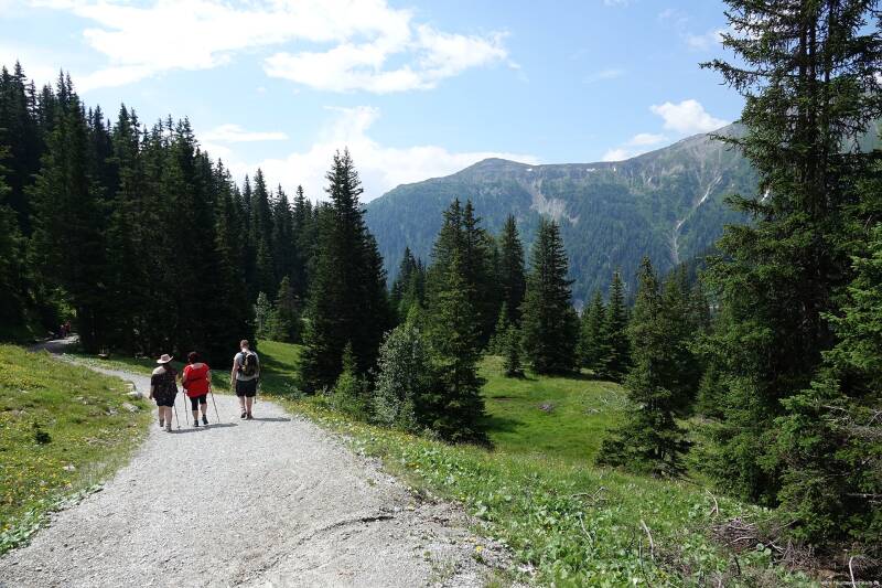 Onze conditie heeft ooit betere tijden gekend. Terwijl het beneden in het dorp al serieus warm aan het worden is, is het boven gelukkig voor ons een stuk frisser. Perfecte omstandigheden om te wandelen. Goed ingesmeerd met zonnebrandcrème zetten we de afdaling richting Urgsee in.