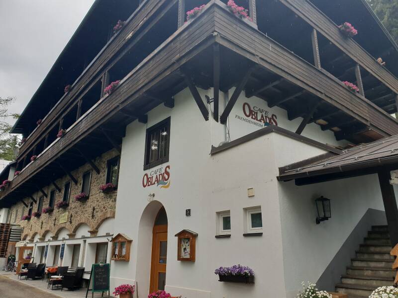 Na nog een dik uurtje stappen komen we aan bij het doel van deze wandeling : Café Obladis. Deze zaak hebben we hier 15 jaar geleden ontdekt en sindsdien komen we elke keer we in Serfaus of Fiss verblijven naar hier om een lekkere ijscoupe te eten.
