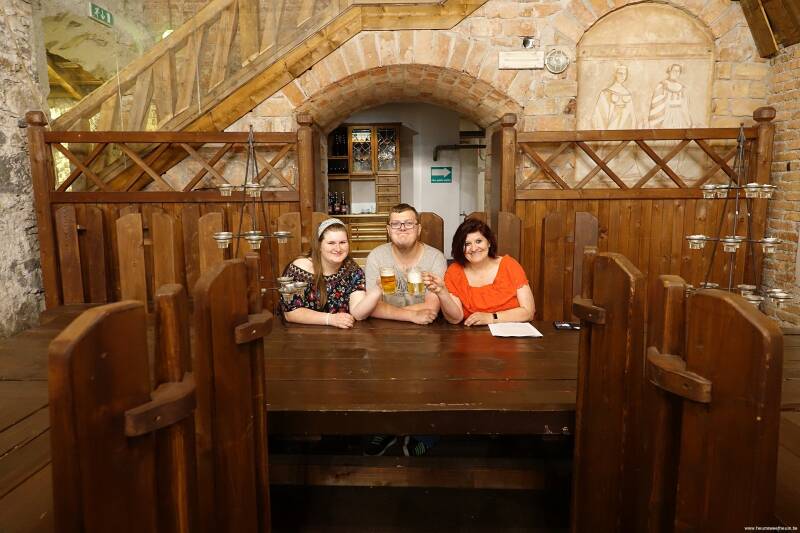 Na ons verblijf in de ridderzaal dalen we nog dieper af in het gebouw. We zitten in kelders van het originele kasteel dat dateert van 1310. Wie het wil kan hier zelfs rondlopen in de dubbele muren. En dan gaat het weer met de trap omhoog en komen we in de souvenirshop van de brouwerij terecht. We vinden hier één en ander wat ons wel aanstaat en leveren onze bijdrage aan de omzet de shop. Van de vriendelijke dame in de shop leren we dat ze hier ook een Vlaamse medewerker hebben die geleide bezoeken doet. Deze man heeft een typisch Belgisch beroep, hij is ski-leraar in een Pitztal, maar in zijn vrije tijd komt hij hier gidsen.