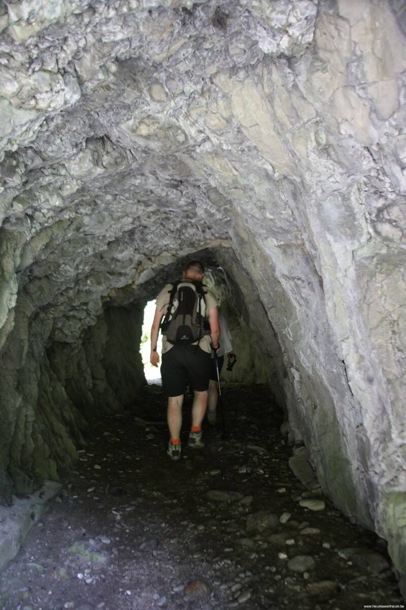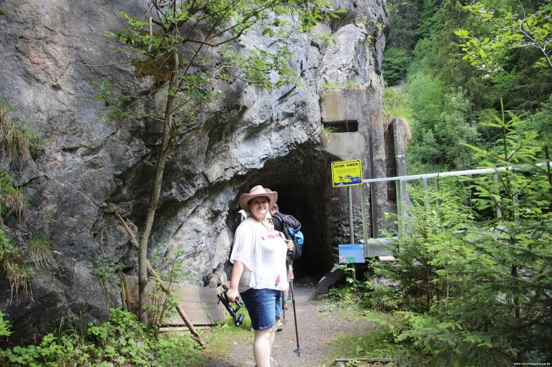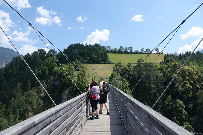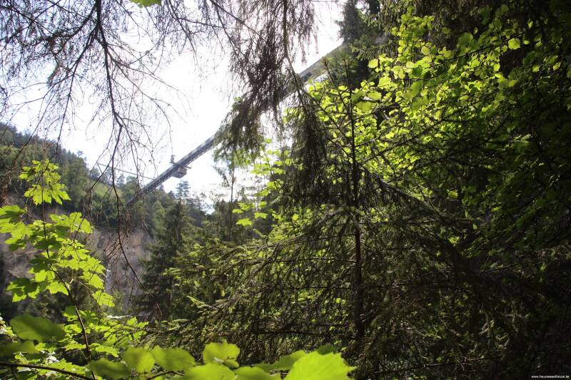 Als we beneden in de Klamm staan zien we de Benni Graich Brücke boven ons. Dat wil zeggen dat we minstens 94 meter naar boven moeten klauteren voor we daar zijn. Hierbij vloeien de nodige liters zweet. Maar gelukkig wacht er boven aan de brug een terrasje op ons.