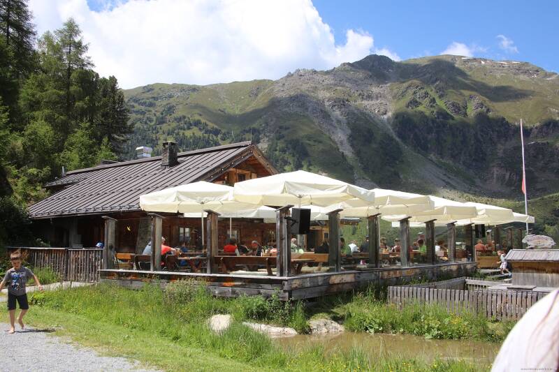Zoals gezegd is de afdaling een serieuze uitdaging voor onze spieren. We moeten meer dan 600 meter dalen vooraleer we aan onze eerste tussenstop aankomen. Dat is de Schöngamp-Alm, die deze zomer ook open is. We zijn hier een paar jaar geleden al eens voorbij gekomen, maar toen was alles dicht. Nu zitten er al veel wandelaars en fietsers (BMX, Mountainbike) op het terras. We brengen ons vochtniveau terug op peil en genieten ook nog van een lekker soepje.
