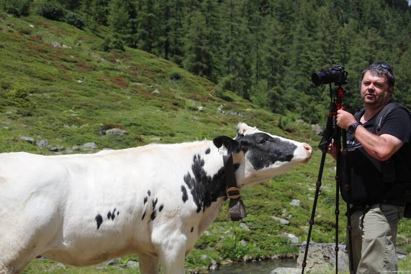 Normaal gezien zijn de koeien die in Tirol tijdens wandelingen tegenkomt eerder van het passieve type, en al helemaal niet geïnteresseerd in de mensen die er voorbij wandelen. Deze keer hebben we echter een tegenovergesteld exemplaar tegen het lijf gelopen. Het dier was met geen stokken uit onze buurt te houden. Ze moest overal aan kunnen likken. Als ze dan ook nog een meer dan normale interesse begon te vertonen voor het fotomateriaal van Patrick, die net aan het proberen was om een watervalletje te fotograferen, toen was de pret er af.
