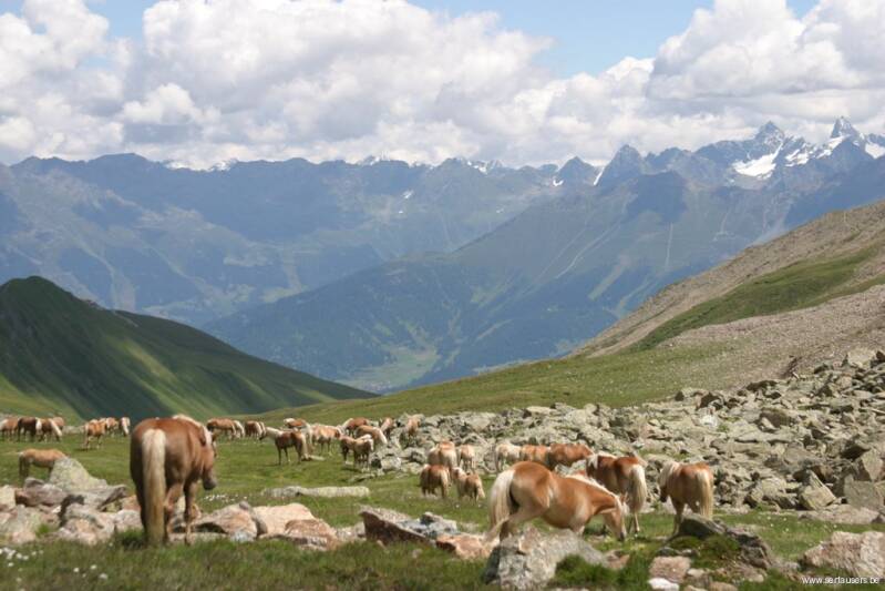 Ondertussen hebben we ook wat gezelschap gekregen. Er staan hier Haflinger-paarden te grazen. Deze paarden worden hier in deze streek gekweekt en lopen hier vrij rond.