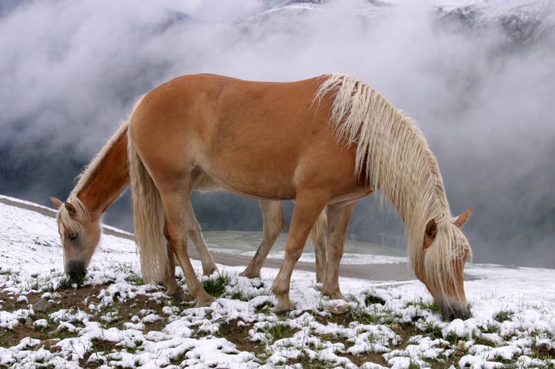 We zijn niet alleen daarboven op de Lazig. Een hele kudde Haflingerpaarden komt ons tegemoet. Waarschijnlijk vinden zij het een beetje te fris naar hun zin. Of zijn ze op zoek naar een streepje gras dat niet onder de sneeuw ligt.