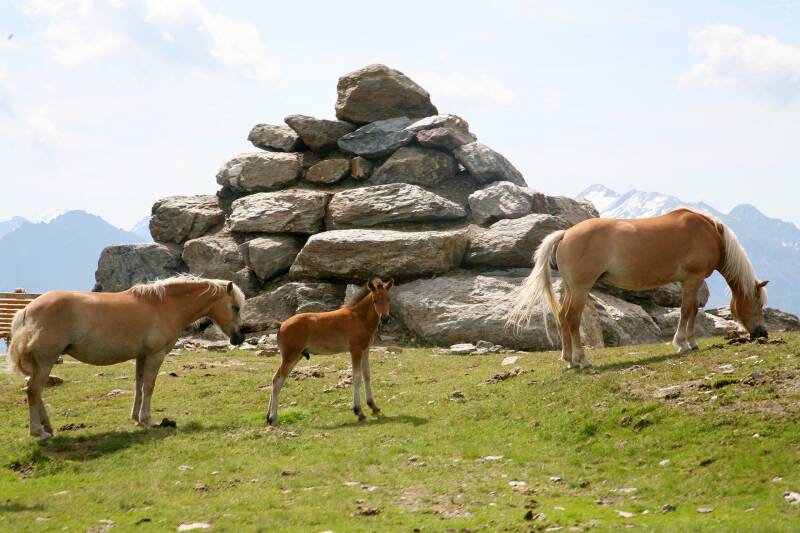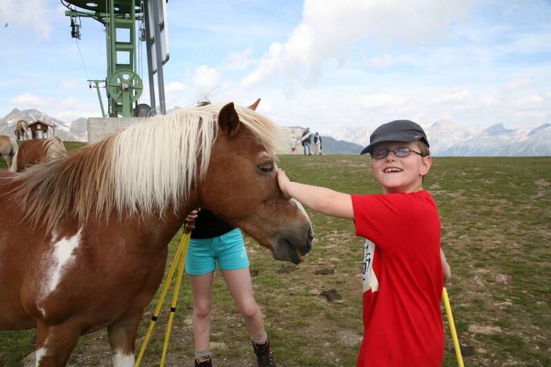 Na een korte sanitaire stop in het Bergdiamant restaurant trekken we naar het kruis op de Schönjochl. Daar zijn we niet alleen, er loopt ook nog een kudde Haflingerpaarden rond. En die zijn helemaal niet mensenschuw.