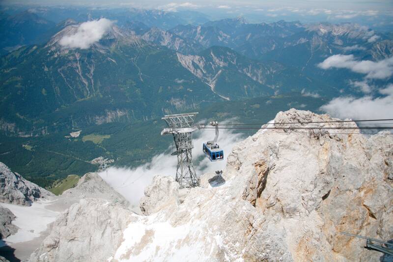 Via de Fernpas rijden we naar Ehrwald, waar zich het dalstation van de Tiroler Zugspitzbahn bevindt. Als we daar aankomen is de top van de berg nog in de wolken gehuld.