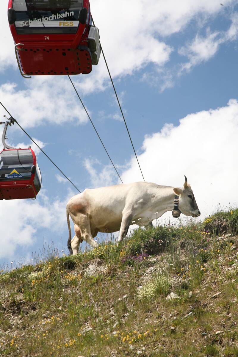 Voor onze eerste wandeling trekken we naar Fiss, dat doen we door in Serfaus de Sunlinerbaan te nemen en vervolgens tot aan de Möseralm te stappen. Met de Möseralmbaan dalen we dan terug af naar Fiss waar we vervolgens overstappan op de Schönjochbaan die ons helemaal tot boven brengt. De kaartjes voor de kabelbanen die we hier elk jaar krijgen bewijzen al meteen hun nut. Je mag de kabelbanen zoveel en zo vaak je maar wil gebruiken als je hier op vakantie bent.
